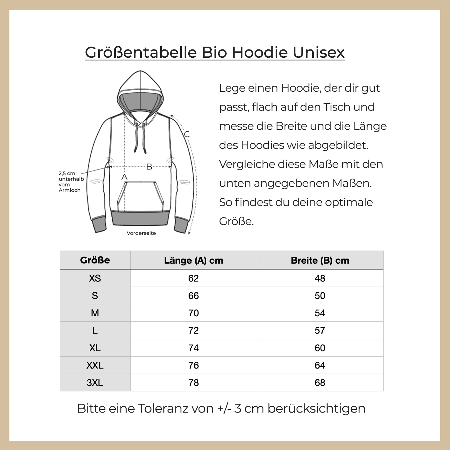 Wenn du deinen Hoodie erhältst, kann es sein, dass du einen "Essiggeruch" wahrnimmst, der nach der ersten Wäsche aber wieder weg ist. Das kommt daher, dass der Stoff beim Druck mit einer Bio-Essiglösung (also keine Chemikalien!) behandelt wird, damit der Druck langlebig und widerstandsfähig bleibt. Da wir schnell liefern, solltest du dein Produkt erst nach 5 Tagen waschen, damit diese Imprägnierung lange genug einwirken kann.