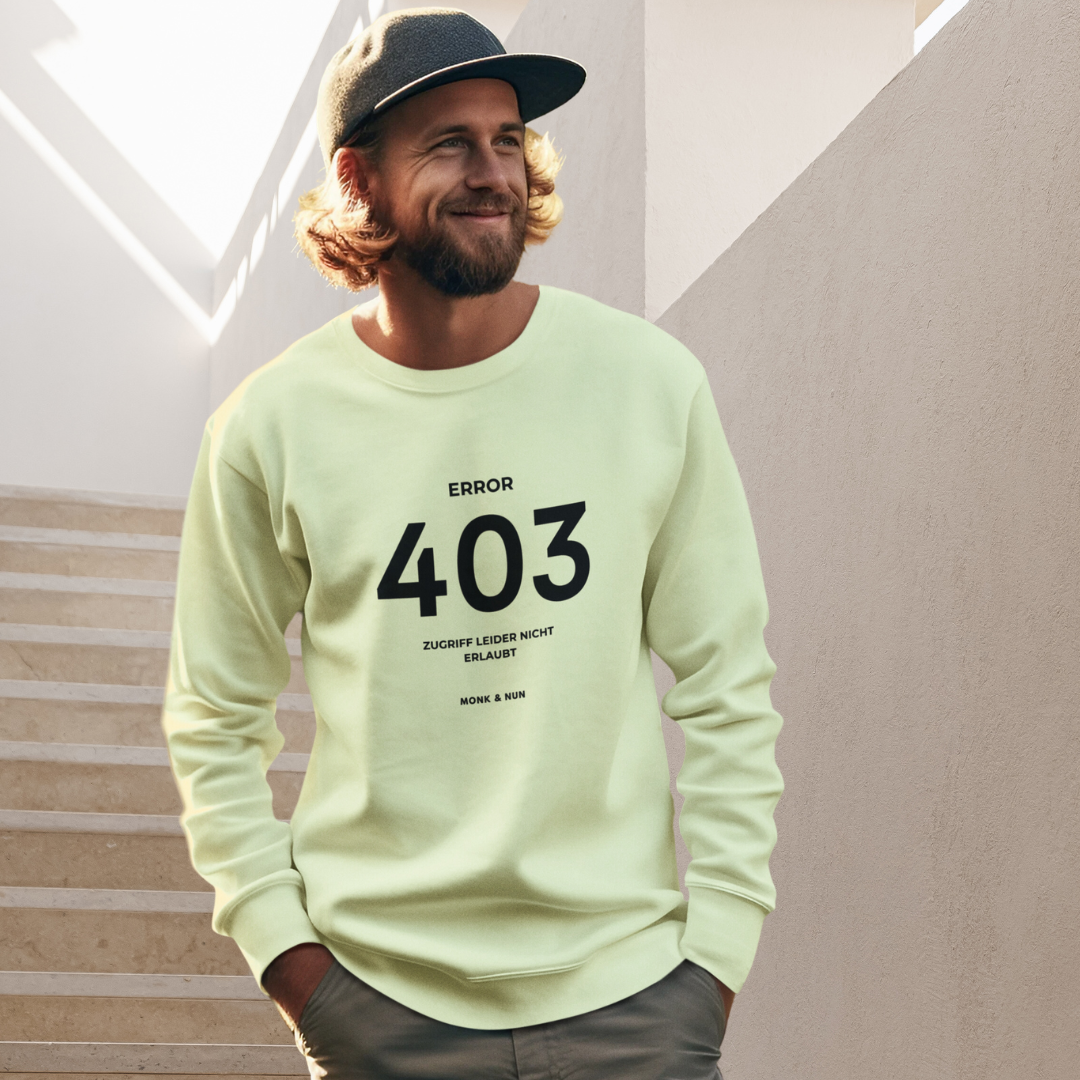 Der Fehlercode 403 steht typischerweise für den Status "Zugriff verboten", aber auf diesem lässigen Sweater wird er mit einem Augenzwinkern präsentiert. Für alle, die gerne einen Hauch von Humor in ihren Alltag einbringen möchten. 😉
